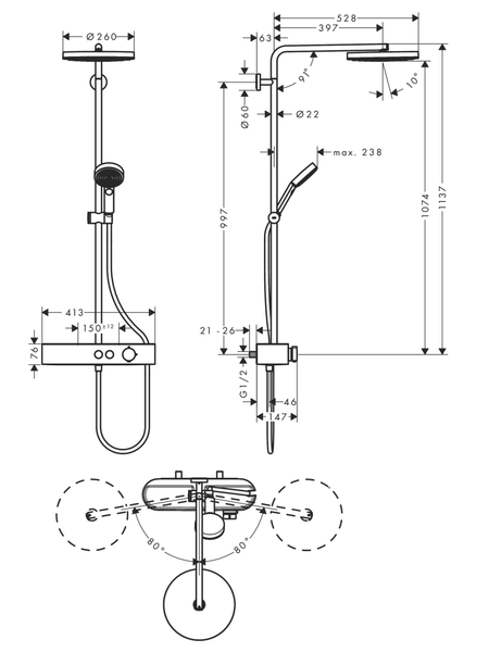 Phần nhô ra của tay sen: 397 mm, đường kính vòi sen đầu: 260 mm